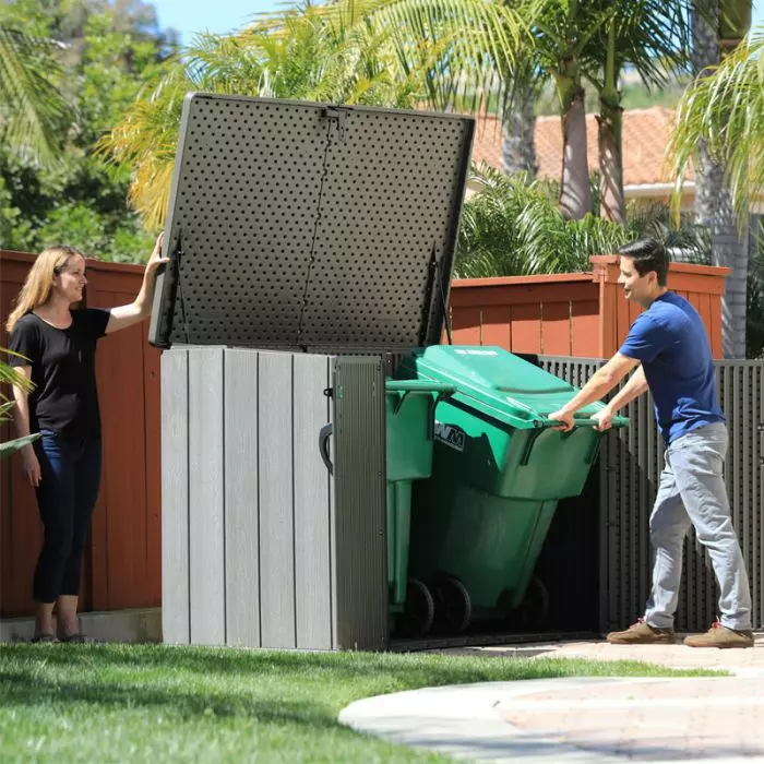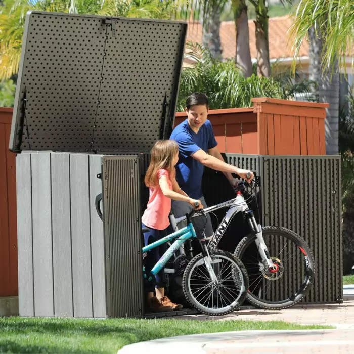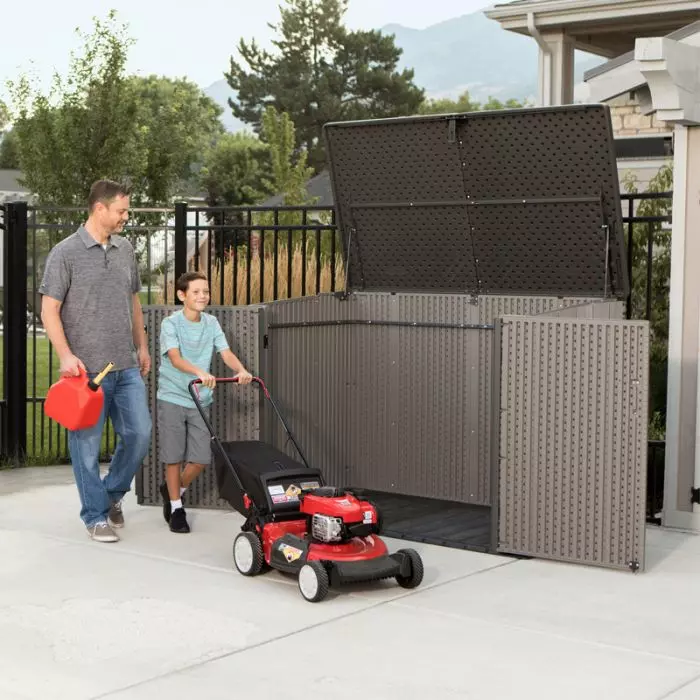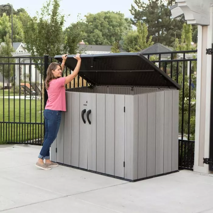 La capacità è di 21248 L, ha anche un sistema di chiusura con lucchetto (lucchetto non incluso) e 3 aperture, il coperchio e due ante completamente apribili frontali, comodissime per riporre oggetti di grandi dimensioni in totale comfort e sicurezza.
