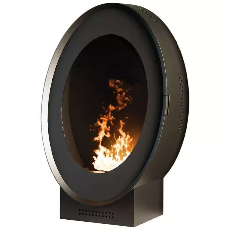 La struttura realizzata in acciaio nero verniciato esalta la forma ovoidale. L'ampia vetrata offre una vista della fiamma che irradia calore e luminosità nel tuo salotto.