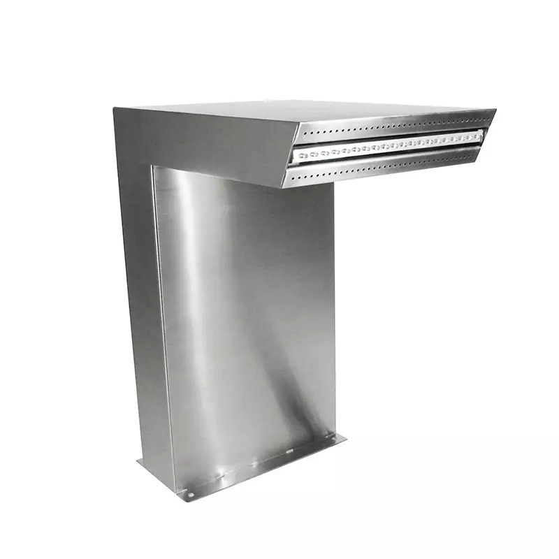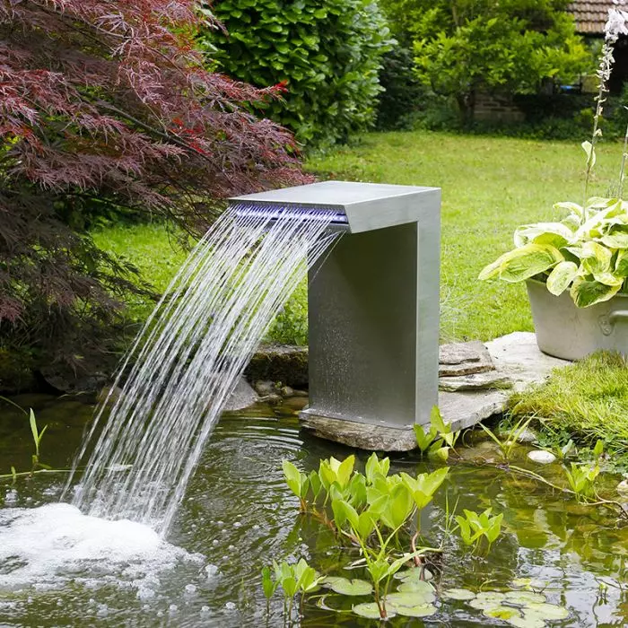 Cascata DRITTA in acciaio Inox 316 moderna ed elegante. Dotata di un efficace LED di illuminazione integrato e 72 getti d'acqua distribuiti su due file.