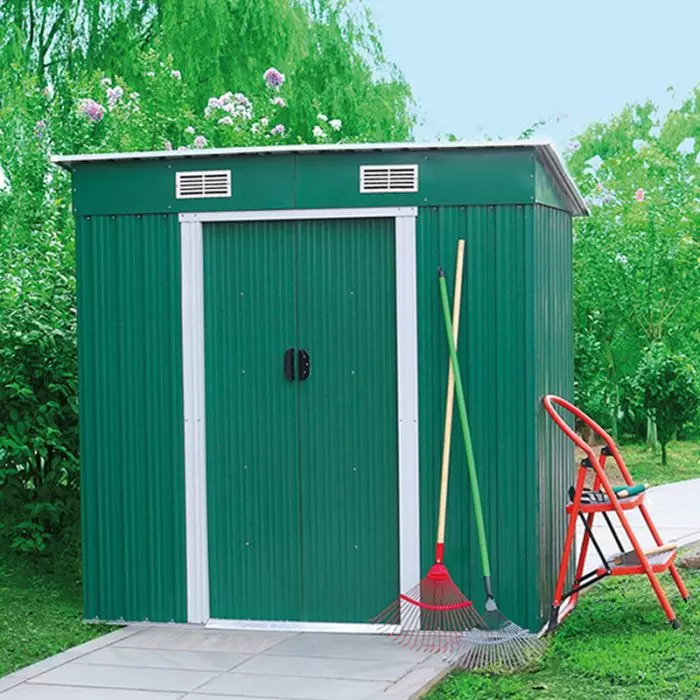 Casetta da giardino in lamiera preverniciata Medium StoreCasetta in lamiera di alluminio verniciato MEDIUM STORE, di colore verde con profili chiari a contrasto.