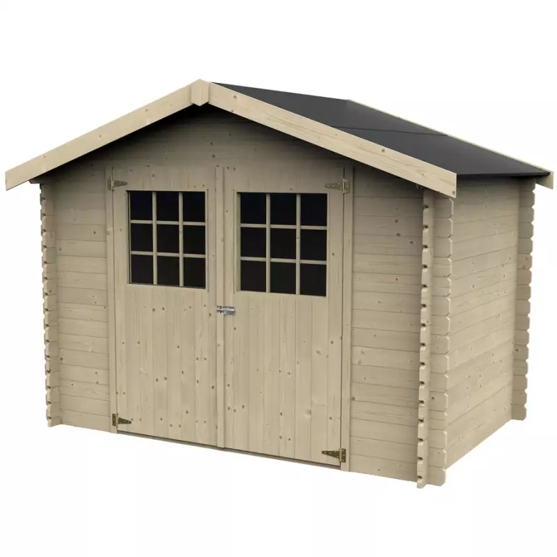 La casetta da giardino TAIGA è costruita con spesse pareti in legno da 28 mm con sistema blockhouse, per una installazione a incastro senza necessità di fissaggio con viteria.