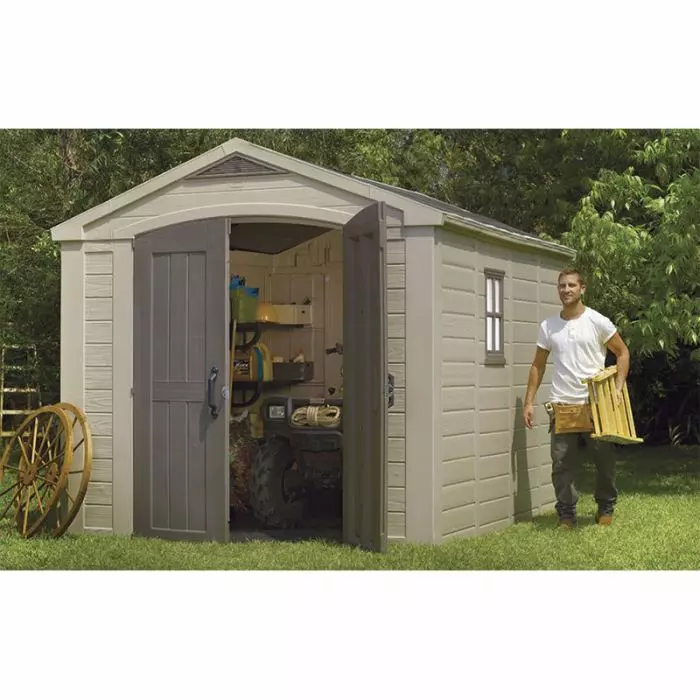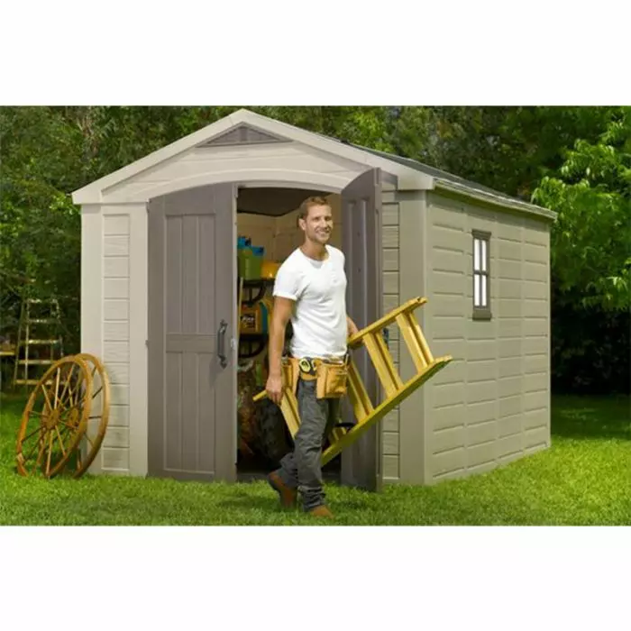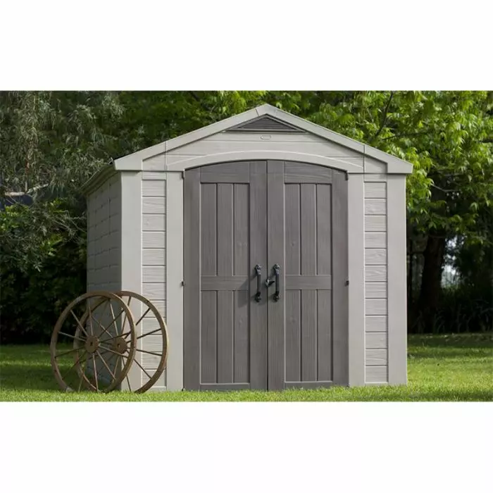 Casetta da esterno in resina FACTOR 8X11 firmata KETER prodotta con pannelli che richiamano l'estetica del legno.