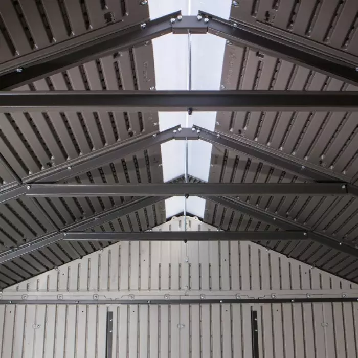 Il colore è sabbia con venature effetto legno e porte color grigio scuro, il tetto è realizzato con capriate in acciaio e dotato di lucernario a tutta lunghezza e ci sono 2 finestre in policarbonato apribili a metà.
