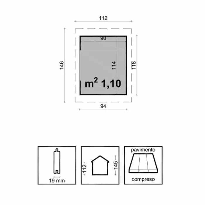 • Dimensioni esterne con sporgenza tetto : L 112 x P 146 cm (1,64 m2)