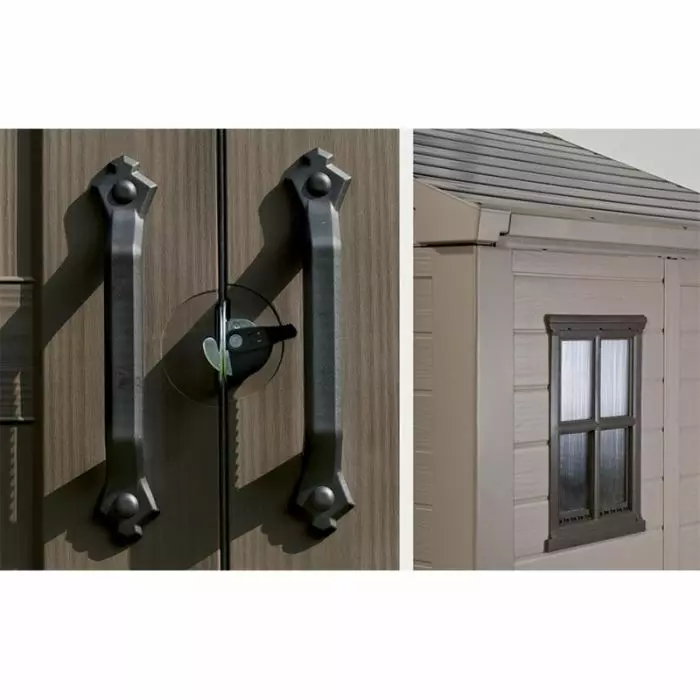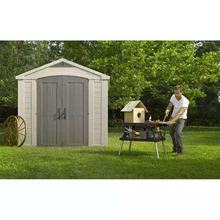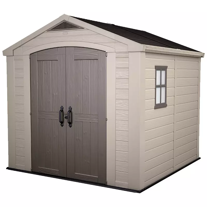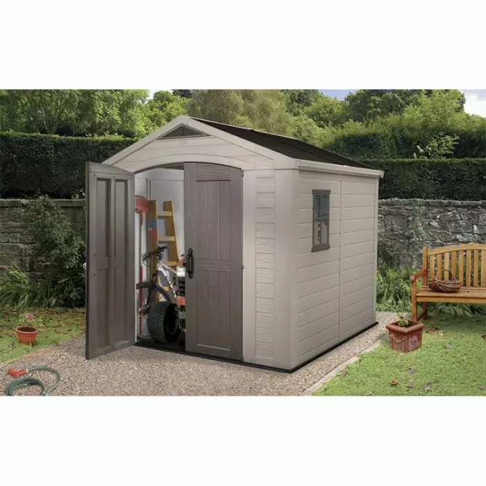 Casetta da esterno FACTOR 8X8 firmata KETER in resina con elegante finitura e colore simili al legno.