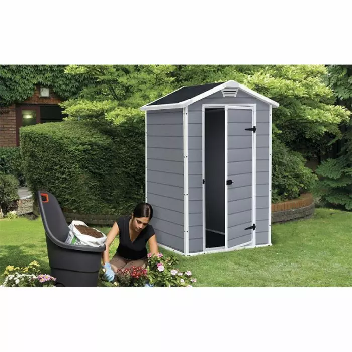 Casetta da esterno in resina MANOR 4X3 firmata KETER di dimensioni compatte, è adatta anche agli spazi più stretti.