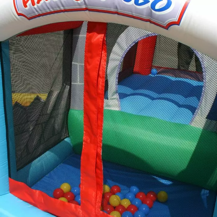 Il castello gonfiabile HAPPY CASA è provvisto di zona per i salti, vasca con palline incluse, salterello e scivolo.