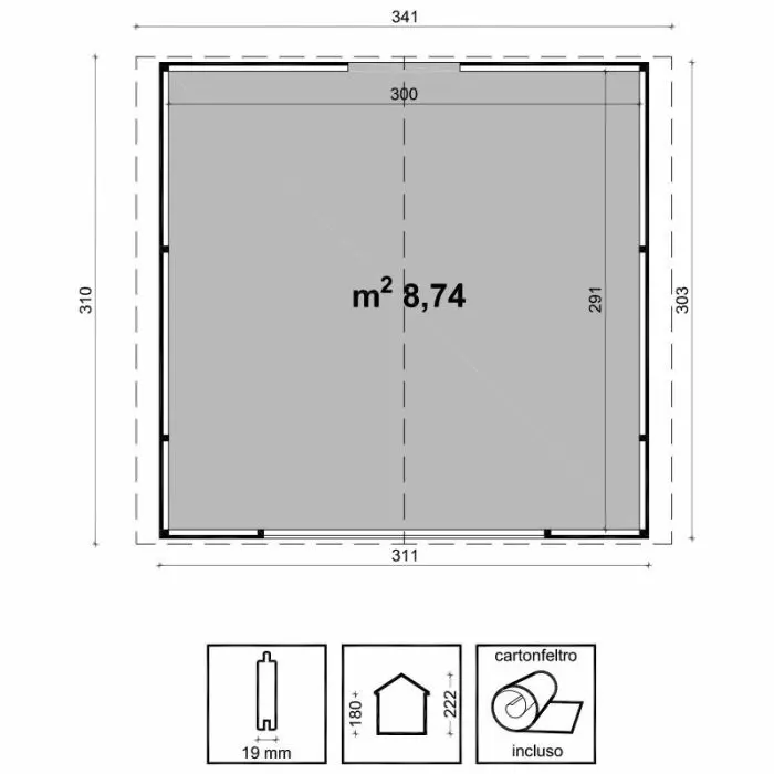 • Dimensioni esterne a terra: L 311 x P 303 cm (9,42 m2)