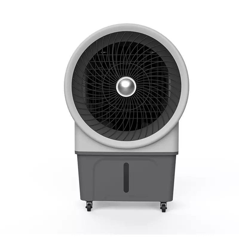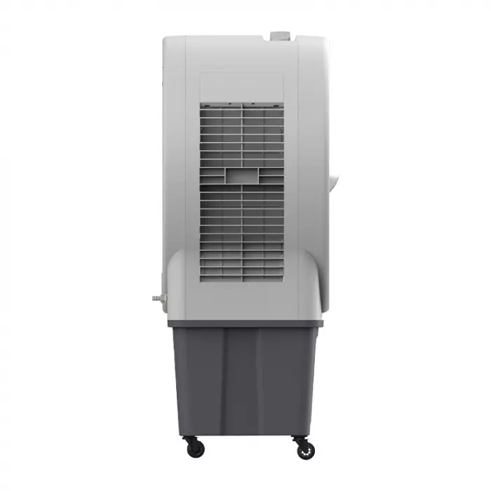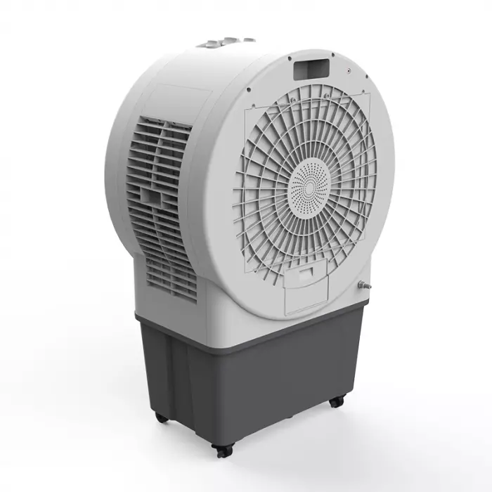 Il sistema di raffreddamento utilizza una ventola che aspira l'aria esterna, dirigendola verso un pannello a nido d'ape in cellulosa, bagnato da acqua fredda, posizionato all'interno del condizionatore. L'aria, una volta reintrodotta nella stanza, ha una temperatura inferiore, offrendo un effetto di rinfrescamento.