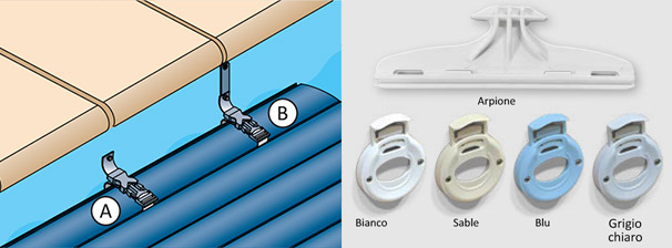 (C) - Dispositivo Coverlock: arpione da agganciare alle doghe tramite supporto ad incastro da attaccare alla parete della piscina.