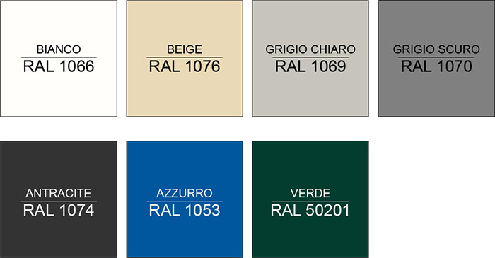 Oltre ai colori qui esposti, siamo in grado di realizzare altre colorazioni su richiesta. Richiedi un preventivo gratuito al numero 0522/15.36.417 per maggiori informazioni.
