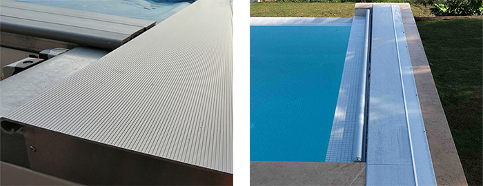 Binari guida realizzati in alluminio e posizionati sotto il bordo della piscina.