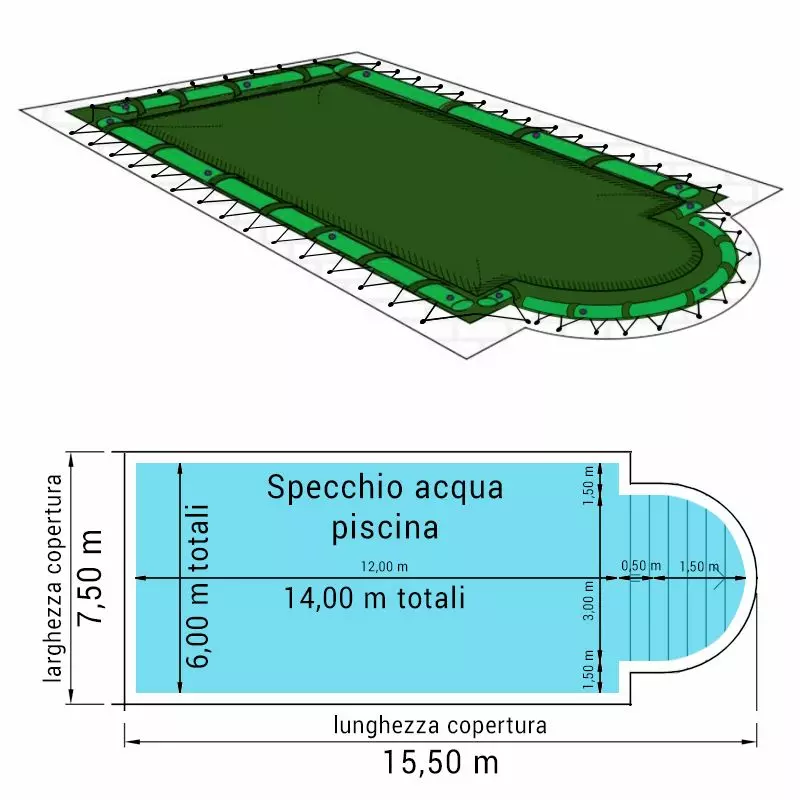 • Piscina con specchio acqua 14,00 x 6,00 m - copertura 15,50 x 7,50 = 116,25 m2 con occhielli, corda elastica e 46 ml di salamotti (pioli/picchetti necessari ma non inclusi n° 92)