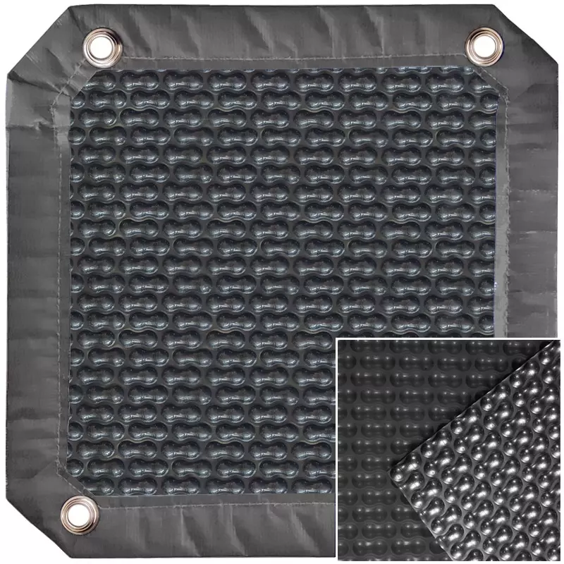 La copertura isotermica BUBBLE BUBBLE a doppia estrusione di polietilene, ha la superficie superiore opaca di colore blu notte e quella inferiore trasparente nera.