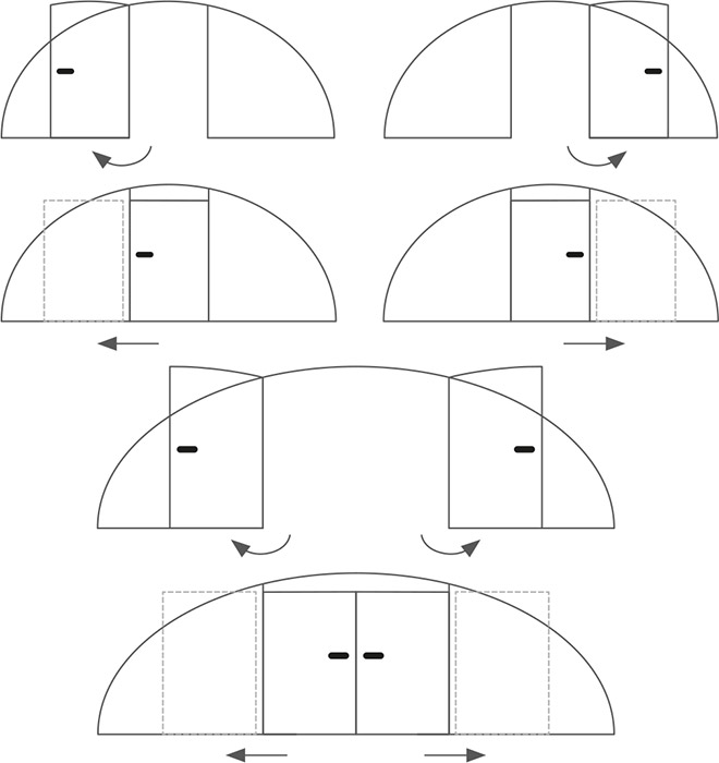 I blocchi sono installati con accesso dall'esterno, ad eccezione del modulo più piccolo, dove sono predisposti per l'accesso dall'interno e non sono bloccabili, in modo da consentire l'uscita a chiunque dovesse rimanere accidentalmente chiuso all'interno della copertura telescopica.