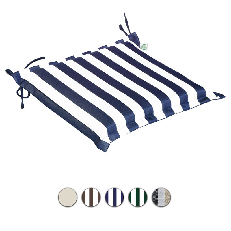 Il cuscino è quadrato con misura 38x38 cm e l'imbottitura è alta 4 cm. Disponibili in colori tinta unita e 3 fantasia a righe.