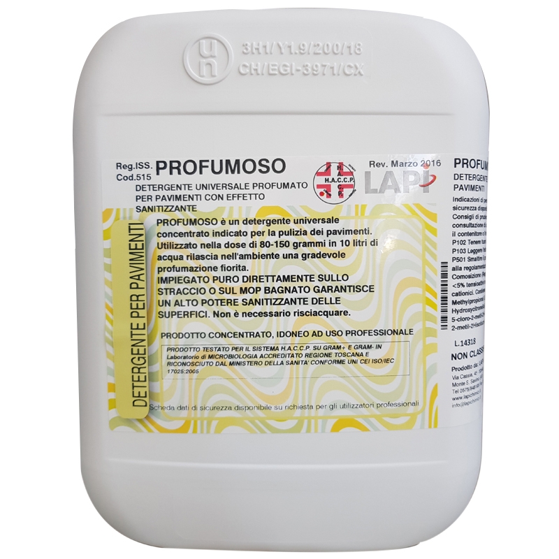 PROFUMOSO è un detergente universale per pavimenti con effetto sanitizzante. Un unico prodotto per pulire, deodorare e sanificare.