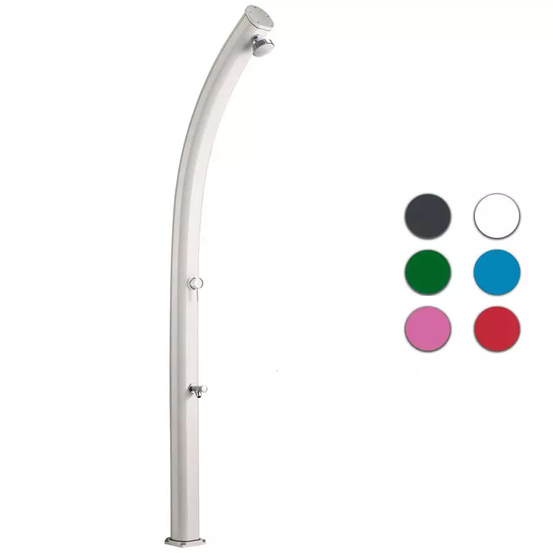 Doccia da esterno in alluminio JOLLY CURVA con lavapiediMiscelatore per scegliere la temperatura dell'acqua desiderata: calda, fredda, temperata.