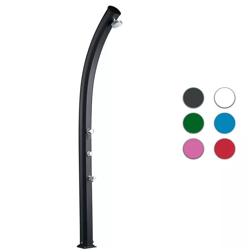 Il corpo della doccia è realizzato 100% in alluminio verniciato a polvere e con trattamento anticorrosione; gli accessori sono cromati.