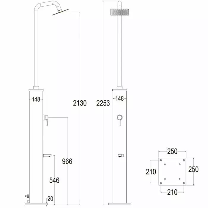 Doccia solare in alluminio DINO con lavapiediBase doccia da fissare al suolo.