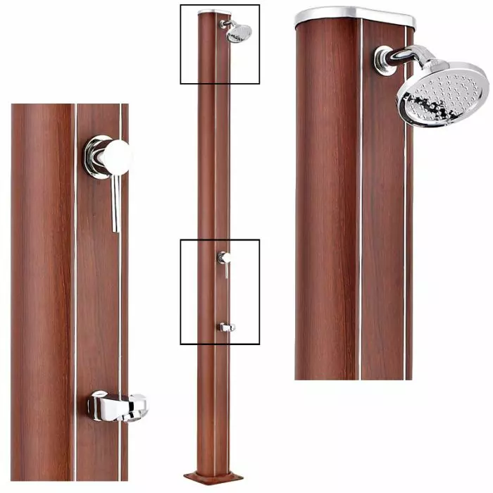Doccia solare per piscina JOY 32 LITRI in alluminio effetto legno, con lavapiediMiscelatore per scegliere temperatura e intensità del getto d'acqua.