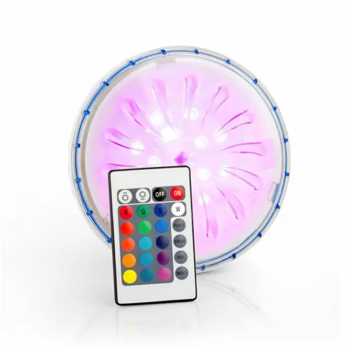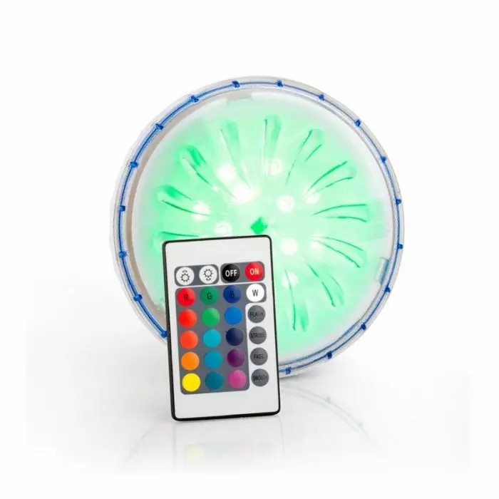 Faretto Led GRE multicolor per piscine fuori terra, dotato di foglio adesivo con magnete pronto all'uso e di un telecomando per un facile utilizzo a distanza.