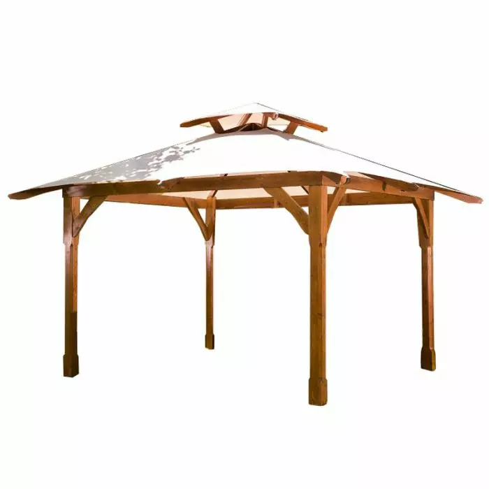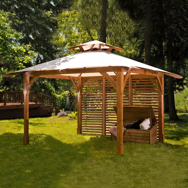 Il gazebo in legno CANOPY LUX è realizzato in legno di abete di alta qualità, con tetto rivestito in tessuto di poliestere 100% impermeabile e antivento.