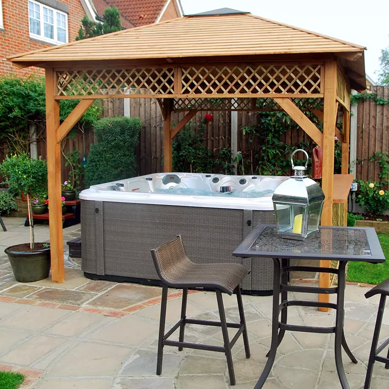 Il gazebo in legno BALTIC è elegante e versatile allo stesso tempo: può essere utilizzato come riparo per vasche spa idromassaggio, per cene all'aria aperta o come luogo di relax da soli o in compagnia.