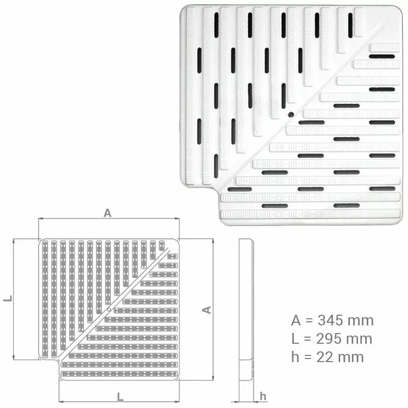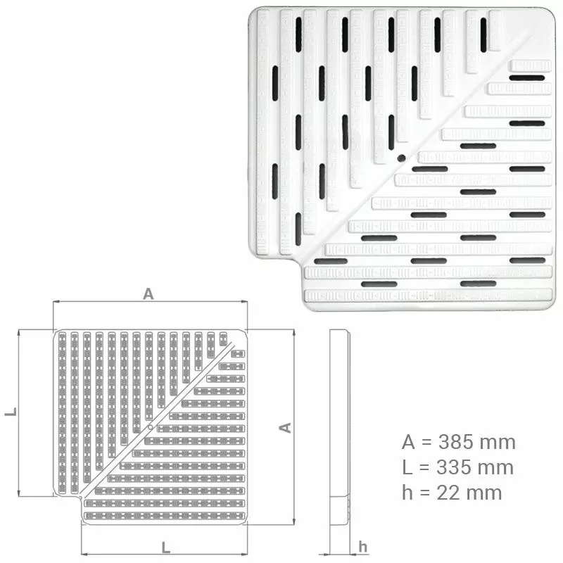 Griglia ad angolo 90° in polipropilene (PP) stabilizzato all'azione dei raggi U.V. di colore bianco.