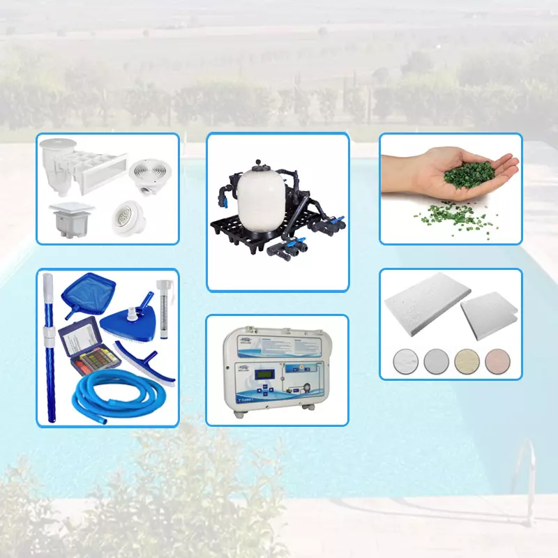 I kit più accessoriati hanno anche i bordi, i kit di pulizia, il sistema di illuminazione notturno, la centralina per il dosaggio automatico dei prodotti chimici.
