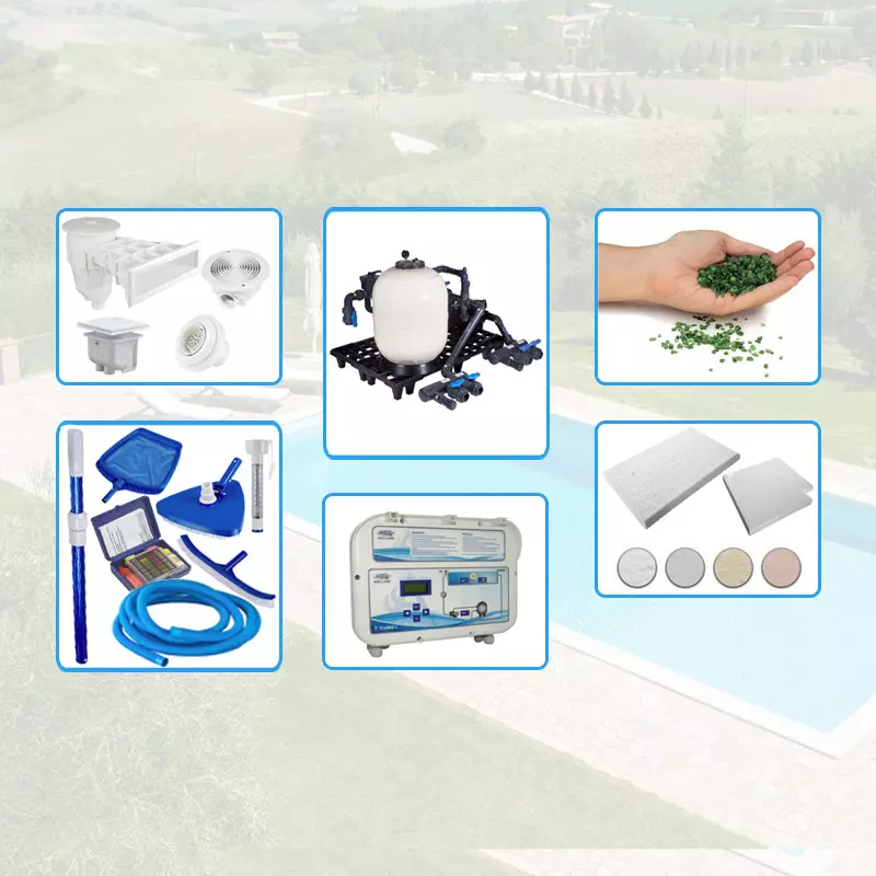 I kit più accessoriati hanno anche i bordi, i kit di pulizia, il sistema di illuminazione notturno, la centralina per il dosaggio automatico dei prodotti chimici.
