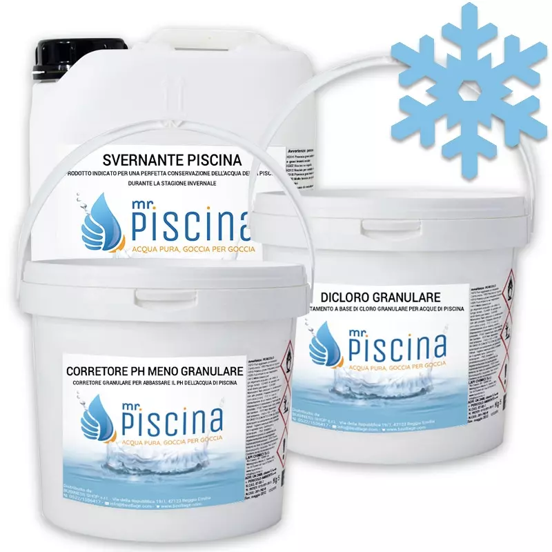 Kit di prodotti chimici appositamente pensato per il momento della chiusura invernale della piscina.