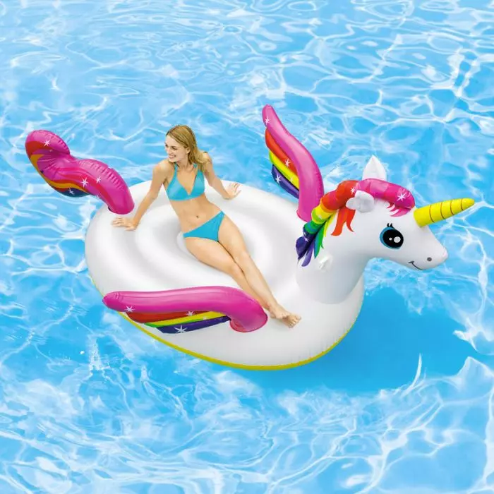 Isola gonfiabile a forma di unicorno bianco con particolari multicolore, un materassino gonfiabile gigante by Intex, tra i più grandi della sua categoria.