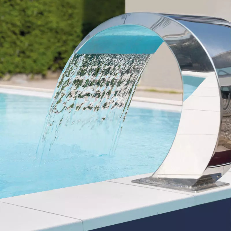 Cascata monoblocco di design in acciaio INOX aisi 316-L satinato installabile in modo semplice e veloce sul bordo della piscina.