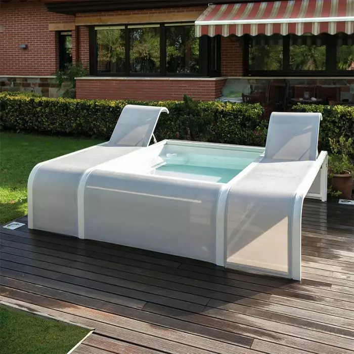 È di forma rettangolare, di dimensioni pari a 2,82 m x 2,19 m, compresi i lettini, per questo è adatta ogni cortile o giardino. Non richiede ulteriore spazio per il sistema di filtrazione, perché la cartuccia e la pompa sono inserite all'interno della vasca stessa.