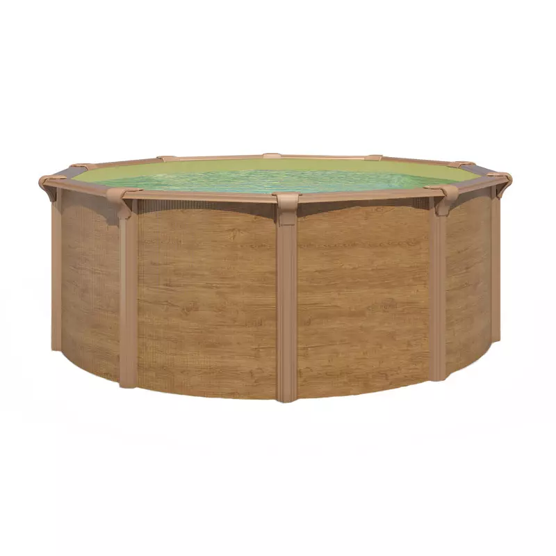 La piscina fuori terra STEELWOOD di forma circolare combina una struttura solida e resistente in acciaio zincato a caldo con un'elegante verniciatura effetto legno.