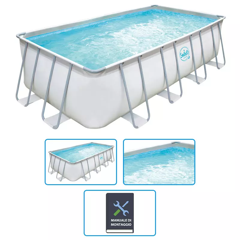 Piscina fuori terra SWING ELITE FRAME di forma rettangolare: ben 5,49 metri di lunghezza per il nostro divertimento, il relax su un materassino prendisole o per personali lezioni di acquagym.