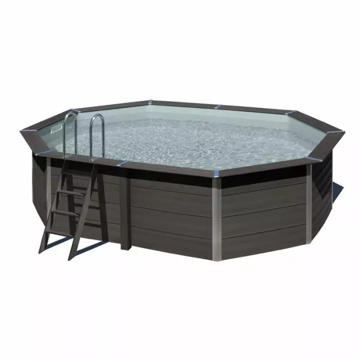 La Piscina in legno composito WPC WOOD 5,24 x 3,86 x h 1,24 m è una piscina ovale in materiale composito di colore antracite.