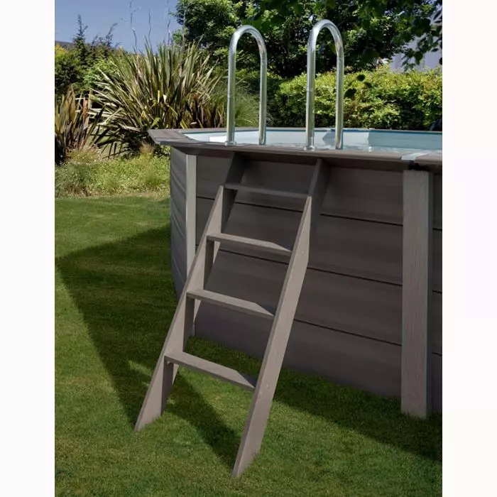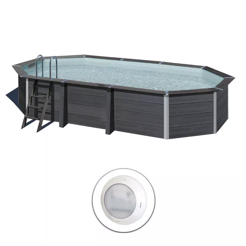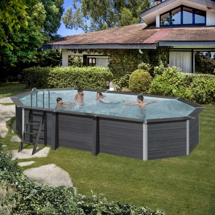 La Piscina in legno composito WPC WOOD 6,64 x 3,86 x h 1,24 m è una piscina ovale in materiale Composito di colore antracite con pannelli già premontati.
