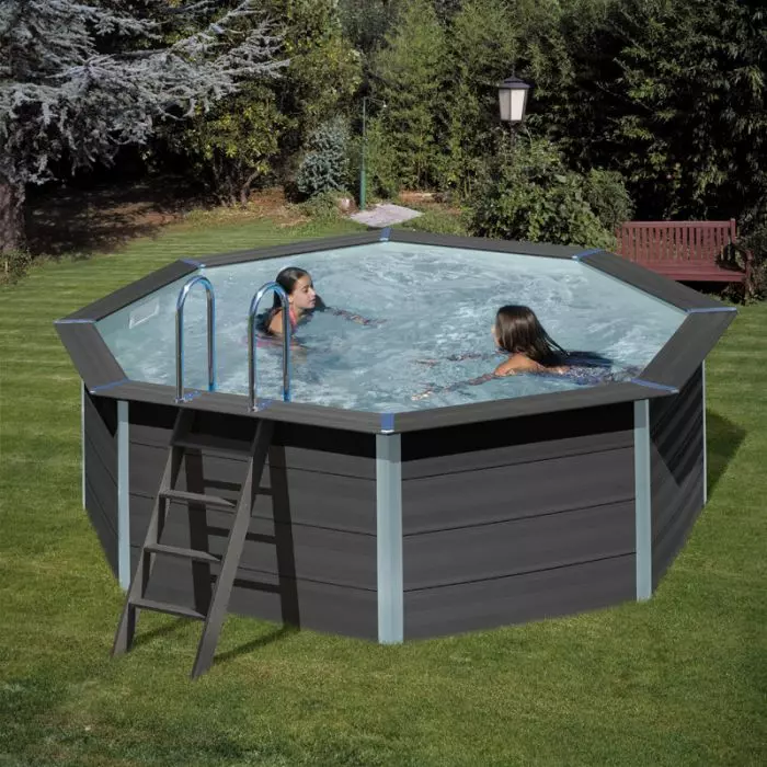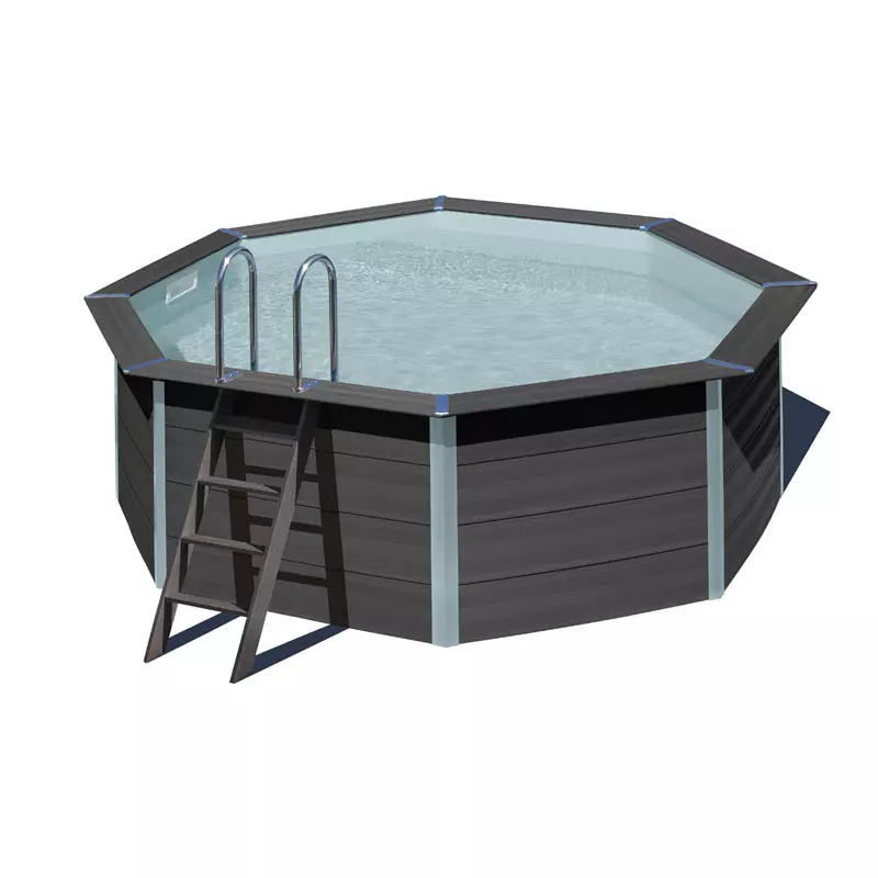 Le piscine in legno composito WPC WOOD vengono prodotte con un nuovo materiale composto da una miscela di farina di legno e polimeri. La struttura costituita da pannelli preassemblati risulta facile da installare e, grazie al suo design elegante, si adatta a tutti gli ambienti. Il liner interno in PVC di colore grigio e con spessore di 0,60 mm è realizzato per resistere ai raggi ultravioletti e agli agenti atmosferici.
