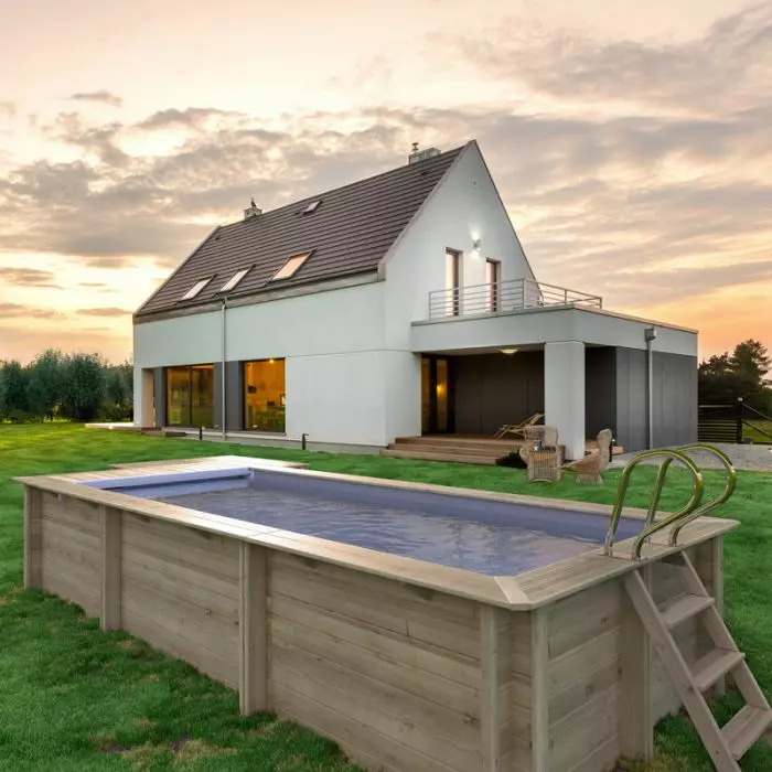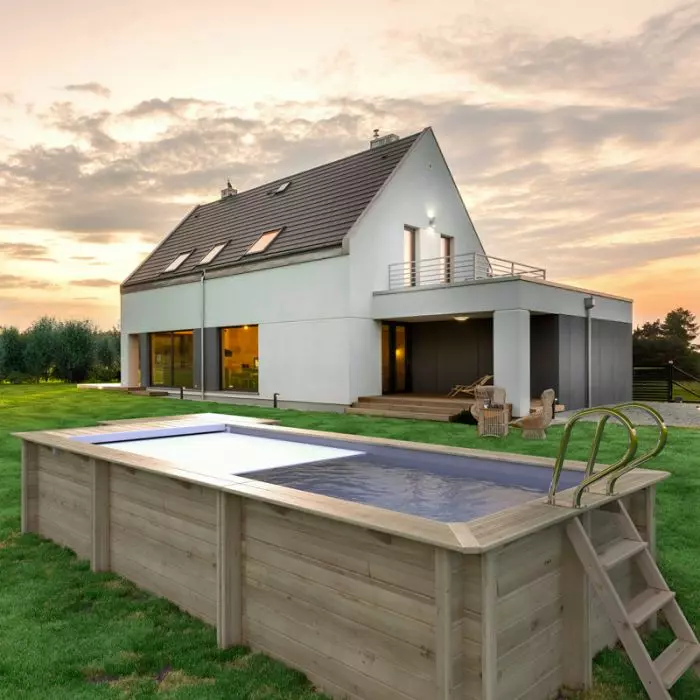 La piscina Urban di forma rettangolare è realizzata in legno di pino nordico ed è dotata di attrezzature di alta qualità.