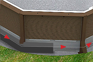 La parte in acciaio della struttura della piscina deve essere coperta con uno strato di terreno. Nel caso di installazione fuori-terra si potrà realizzare un muretto contenitivo della stessa altezza della parte in acciaio.