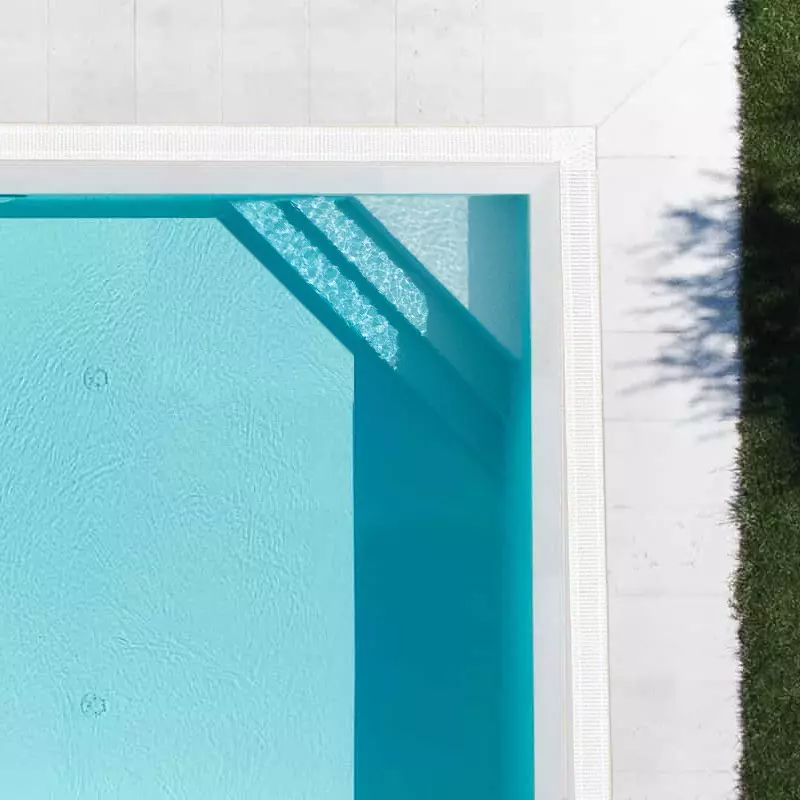 Produzione made in Italy con finitura sabbiata antiscivolo, che la rende calpestabile a piedi nudi e migliora la sicurezza in piscina grazie proprio a questo particolare trattamento.