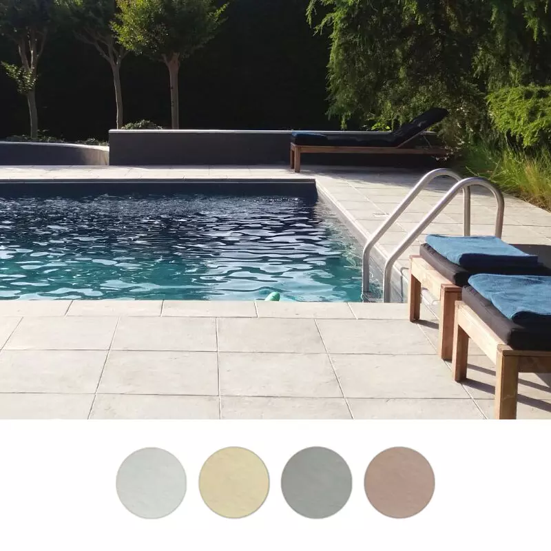 LASTRA/PIATRELLA in pietra ricostruita modello CANOSSA per creare una elegante pavimentazione attorno alla piscina.