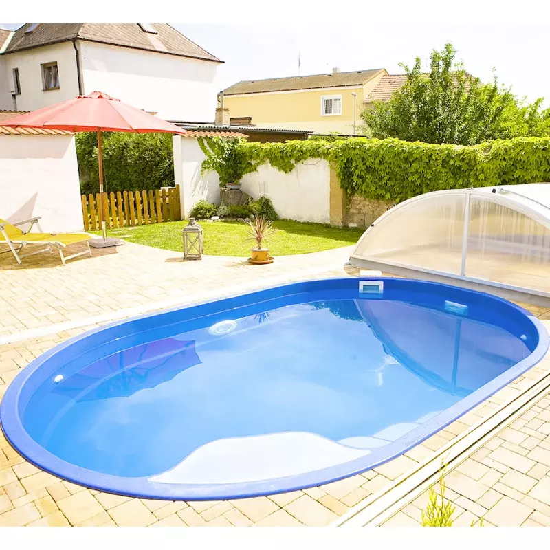Questa piscina è realizzata in vetroresina stratificata, lo strato colorato è resistente ai raggi UV e cloro.