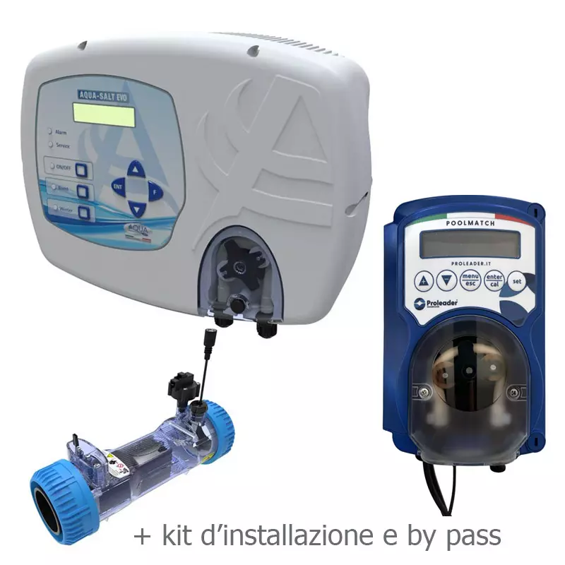 #8 / Kit STERILIZZAZIONE AL SALE e regolazione automatica pH composto da Sterilizzatore Aqua Salt EVO e pompa dosatrice PoolMatch pH + kit by-pass