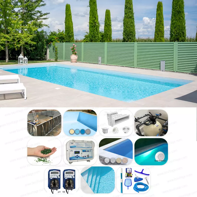 - Kit SENZA PENSIERI: il più completo tra le soluzioni proposte, include una centralina di regolazione automatica cloro e pH per la facile gestione dei trattamenti necessari, una scenografica scala angolare, l'illuminazione LED a luce bianca, elegante e moderna.
