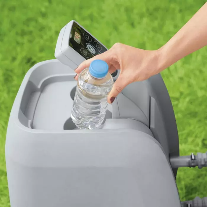 Pannello di controllo digitale e pompa della spa con sistema di filtraggio integrato con porta bicchieri accessibile dall'interno della spa