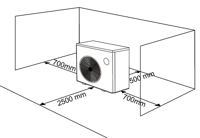 Lasciare uno spazio vuoti di almeno 50 cm ai lati e dietro la pompa di calore