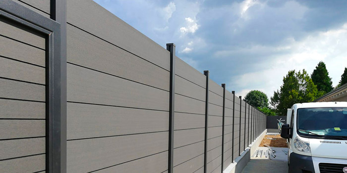 La linea di recinzioni in WPC si arricchisce con il modello PRIVACY TREND realizzato con colonne in alluminio e doghe in wpc disponibili nelle moderne colorazioni grigio chiaro e grigio scuro.